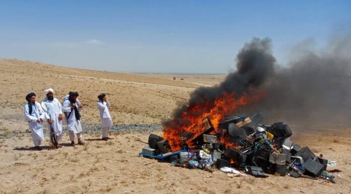MEHTARLAM: The Taliban’s Directorate for Promotion of Virtue and Prevention of Vice in the Alingar district of Laghman province has announced the burning of 109 musical instruments that were collected from public celebrations over the past few months.