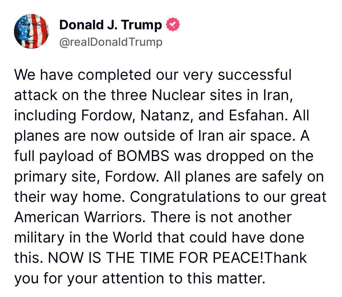 Trump also announced he would speak at the White House at 10 PM regarding the details of the “very successful military operation” in Iran, stating, “This is a historic moment for the U.S., Israel, and the world. Iran must end this war.”