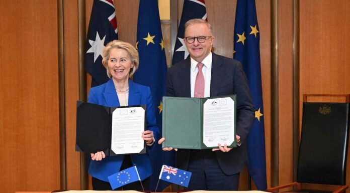Australia and the European Union have signed a trade agreement after eight years of negotiations, under which most tariffs on European exports will be removed and exports of Australia’s critical minerals will be expanded. According to a report by Reuters, the agreement will eliminate more than 99 percent of tariffs on European Union goods exported to Australia. The deal is estimated to be worth around $10 billion annually to the Australian economy. Both sides have also agreed to expand their security and defense cooperation and to share intelligence information to counter global threats, online extremism, and the financing of terrorism. The agreement comes as the European Union is trying to reduce its economic dependence on China and strengthen its presence in the Indo-Pacific region.