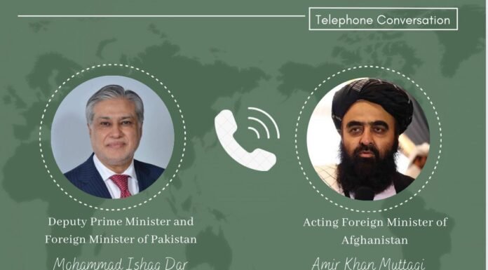 محمد اسحاق دار، معاون صدراعظم و وزیر امور خارجه پاکستان، با امیرخان متقی، سرپرست وزارت امور خارجه طالبان، گفتوگوی تیلفونی انجام داد.