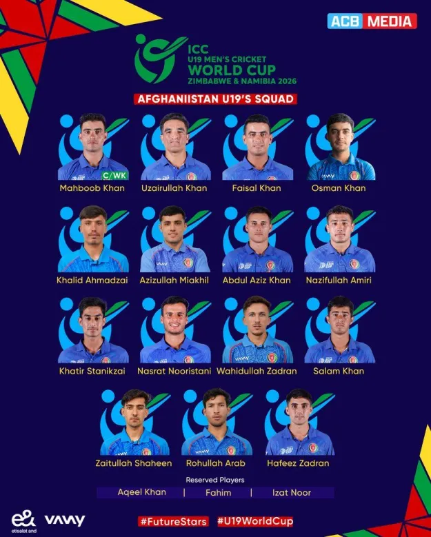 فهرست نهایی تیم ملی کرکت زیر ۱۹ سال افغانستان برای حضور در رقابتهای جام جهانی ۲۰۲۶ اعلام شد. این تیم به رهبری محبوب تسکین در این رقابتهای جهانی به میدان خواهد رفت. ترکیب اصلی تیم ملی کرکت زیر ۱۹ سال افغانستان در جام جهانی را عزیزالله خان، فیصل خان، عثمان خان، خالد احمدزی، عزیزالله میاخیل، عبدالعزیز خان، نظیفالله امیری، خاطر ستانکزی، نصرت نورستانی، وحیدالله زدران، سلام خان و زیدالله شهدزاده تشکیل میدهند. همچنان فهیم، عقیل خان و عزت نور بهعنوان بازیکنان ذخیره به تیم دعوت شدهاند. ملیپوشان روز چهارشنبه برای اشتراک در مسابقات جام جهانی کرکت زیر ۱۹ سال وارد شهر ویندهوک نامیبیا شدند. تیم افغانستان در گروه چهارم این رقابتها با تیمهای افریقای جنوبی، ویستاندیز و تانزانیا همگروه است. نخستین دیدار تیم ملی کرکت زیر ۱۹ سال افغانستان، روز جمعه آینده، ۲۶ جدی، در برابر تیم افریقای جنوبی برگزار خواهد شد. رقابتهای جام جهانی کرکت زیر ۱۹ سال از ۱۵ جنوری ۲۰۲۶ به میزبانی مشترک نامیبیا و زیمبابوی برگزار میشود. بورد کرکت افغانستان با نشر خبرنامهای از آمادگی کامل ملیپوشان برای حضور معنادار در این رقابتها خبر داده است.