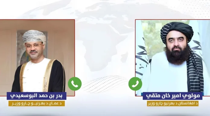 د طالبانو د بهرنيو چارو سرپرست وزير مولوي امير خان متقي او د عمان سلطنت د بهرنيو چارو وزير بدر بن حمد البوسعيدي سره ټيليفوني خبرې وکړې. په دې مکالمه کې د افغانستان او عمان پر دوو اړخيزو اړيکو، د دواړو هېوادونو ترمنځ د سوداګريزو، ټرانزیټي او ترانسپورتي همکاريو د پراختيا په تړاو هراړخيزې خبرې شوې دي. ښاغلي متقي عمان سلطنت ته خپل وروستی سفر گټور بللی او د دواړو هېوادونو ترمنځ يې په دې وروستيو کې د پلاوو تبادله گڼو برخو کې د همکاريو د پراختيا لپاره مهمه گڼلې ده. مولوي امير خان متقي خپل عماني سيال ته په مناسب وخت کې کابل ته د سفر بلنه ورکړه او د دواړو هېوادونو ترمنځ په لوړه کچه يې سلا مشورې گټورې وبللې. د عمان سلطنت د بهرنيو چارو وزير په خپل وار د دوارو هېوادونو ترمنځ د پلاوو تبادله د همکاريو د پراختيا لپاره مهمه بللې او زياته کړې یې ده چې نږدې راتلونکي کې به د عمان د هوايي چلند تخنيکي پلاوی کابل ته سفر وکړي. ښاغلي بدر بن حمد البوسعيدي کابل ته په مناسب وخت کې د سفر چمتووالي وښود او هيله يې څرگنده کړه، چې د سفر پرمهال د دوو اړخيزو همکاريو د پراختيا په اړه گټورې خبرې اترې ترسره شي.