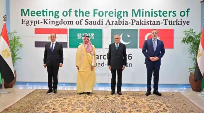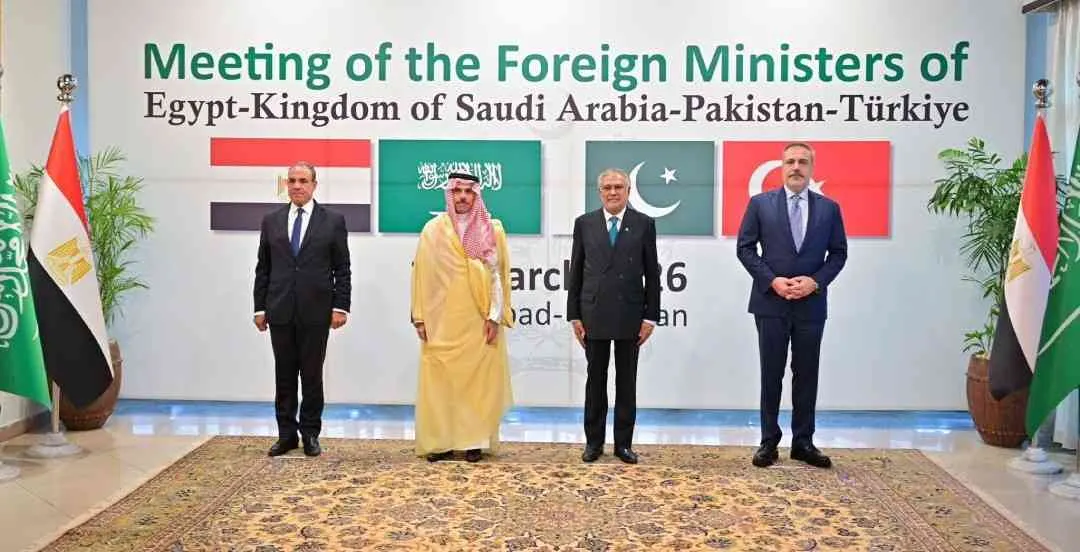 نړیوالو رسنیو راپور ورکړی، چې پاکستان کې د ترکیې، مصر او سعودي عربستان د بهرنیو چارو وزیرانو څلور اړخیزه غونډه شوې، چې په کې د سیمه ییز وضعیت او د ایران د جګړې پر پای خبرې شوې دي. د راپورونو له مخې، د دې غونډې مهم تمرکز د د هرمز تنګي د بیا پرانیستلو او د نړیوالو کښتیو پر تګ راتګ د عادي کولو پر طرحو و. د راپورونو له مخې، په دې اړه ځینې وړاندیزونه امریکا ته هم وړاندې شوي دي. یوې ترکي ډیپلوماټیکې سرچینې ویلي، چې د انقرې لومړیتوب په سیمه کې د اوربند تضمین دی او د کښتۍ خوندي تګ راتګ کولای شي د باور جوړونې مهم ګام وي. راپورونه زیاتوي چې ښايي د سیمې هېوادونه د هرمز تنګي د مدیریت لپاره ګډ میکانېزم یا کنسرسیوم جوړ کړي، څو د انرژۍ نړیوال بازار له احتمالي زیانمنېدو وساتل شي. دا غونډه په داسې حال کې ترسره کېږي، چې د ایران او لوېدیځو هېوادونو ترمنځ روان کړکېچ د سیمې پر امنیت او نړیوالو اقتصادي لارو ژور اغېز کړی دی.