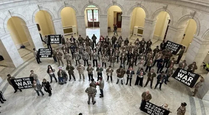 لسګونه پخوانیو امریکايي پوځیانو او د نظامي کورنیو غړو په واشنګټن کې د کانګرس په یوه اداري ودانۍ کې د امریکا او ایران ترمنځ د جګړې پر ضد اعتراض کړی. لاریونوالو د جګړې د دوام پر ضد شعارونه ورکړل او له کانګرسه یې د دې جګړې د درولو غوښتنه وکړه. د راپورونو له مخې، د کانګرس پولیسو له شاوخوا ۱۵۰ اعتراض کوونکو څخه تر ۶۰ ډېر کسان نیولي دي. یوه پخواني سرتېري ویلي، جګړې نه یوازې سرتېرو، بلکې ملکي وګړو ته هم درانه زیانونه اړوي. لاریون کوونکو ټینګار کړی، چې د جګړې دوام به انساني او رواني زیانونه زیات کړي او کانګرس باید د دې مخه ونیسي.